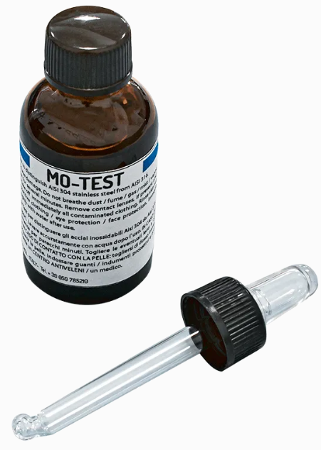 Le réactif molybdène 30 ml est une solution chimique utilisée pour détecter la présence de molybdène dans les aciers inoxydables. Il permet de distinguer rapidement, directement sur la pièce, un inox sans molybdène (type 304) d’un inox allié au molybdène (type 316 / 316L ou autre nuance CrNiMo).